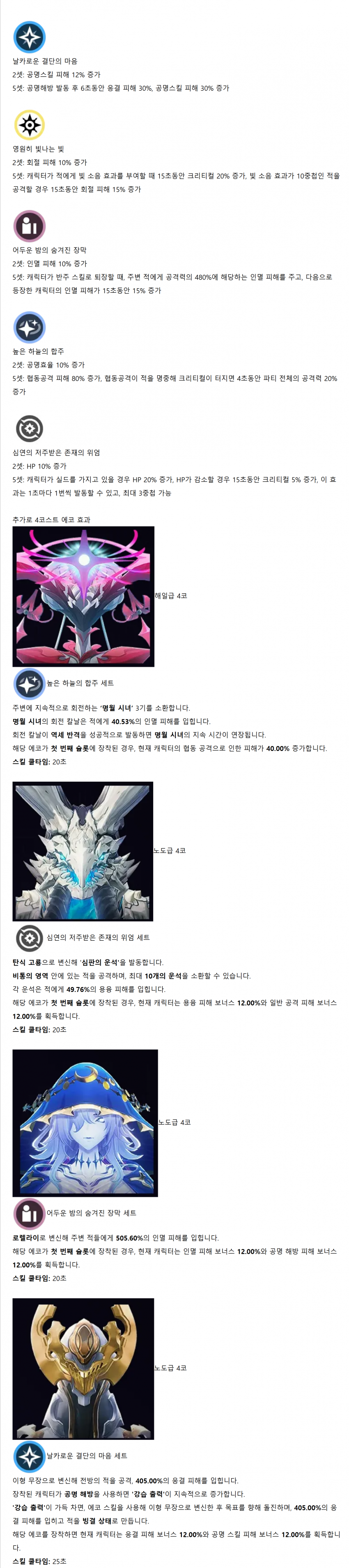 신규 에코 및 기존 에코 변경점입니다. 기대되는 부분이긴 하지만 기존 에코 세트보다 월등히 높은 성능인 에코세트들이 많이 보여서 기존 에코들은 어떻게 변환해줄지 또는 성능 인플레가 얼마나 발생할지는 모르지만, 현재 대비할 수 있는 건 에코 경험치 재료를 미리 캐놓는 것 밖에는 없겠군요.